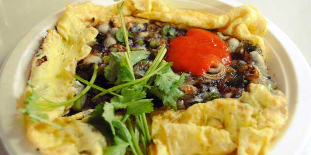 84、海蛎煎:用闽南话讲是蚵仔煎,福建很多地区都有,虽然做法略有不同,海蛎和番薯粉却是必不可少的组成部分。将切碎的韭菜与新鲜的牡蛎搁在一起,加入番薯粉调和,入锅煎至金黄,周围一圈浇上蛋液,口感香脆,内馅香滑,蘸上辣酱更好吃。因为海蛎的营养丰富,有“海中牛奶”之称,这款小吃更是老少皆宜。