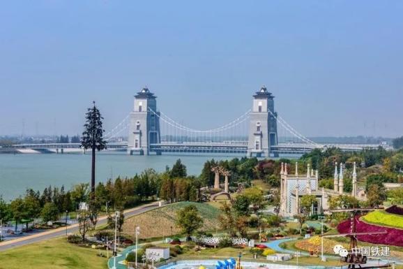 铁四院参与设计的万福大桥是国内首座桥塔结合的双层自锚式悬索桥,全长664米,主跨188米,总体风格为楼台亭阁,整个底座似“凯旋门”,上面有体现扬州古建园林风格的城阁,塔高68米。主桥分两层布置,上层为车行桥,下层为非机动车及人行桥,实现人车分离,登上塔楼,“七河八岛”美景尽收眼底,江广新城一览无遗。