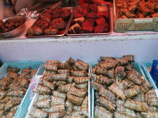 因为葛阿婆而名声大噪的朱家角古镇阿婆粽,从外表来看是细长的枕头粽,个头特别大,能够塞得进两个咸蛋黄和一大块五花肉,用料扎实。粽叶中保留了一半芦苇叶,周身用稻草捆扎,这样包出来的粽子才会更香。如今,这种特殊的粽子包法也在朱家角遍地开花。“我从小在朱家角长大,我们小时候粽子就是这么包的,这么多年来一直没变过。”姚女士说。