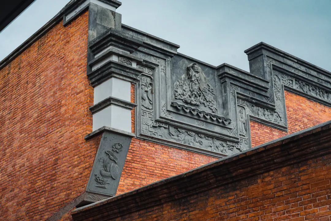 建筑风格中西合璧,雕刻艺术十分精妙,立面采用高低错落的西式三角形山花墙,除花鸟、八骏图、“平升三级”之外,梁、檩、枋上还镌刻着整套《三国演义》故事。