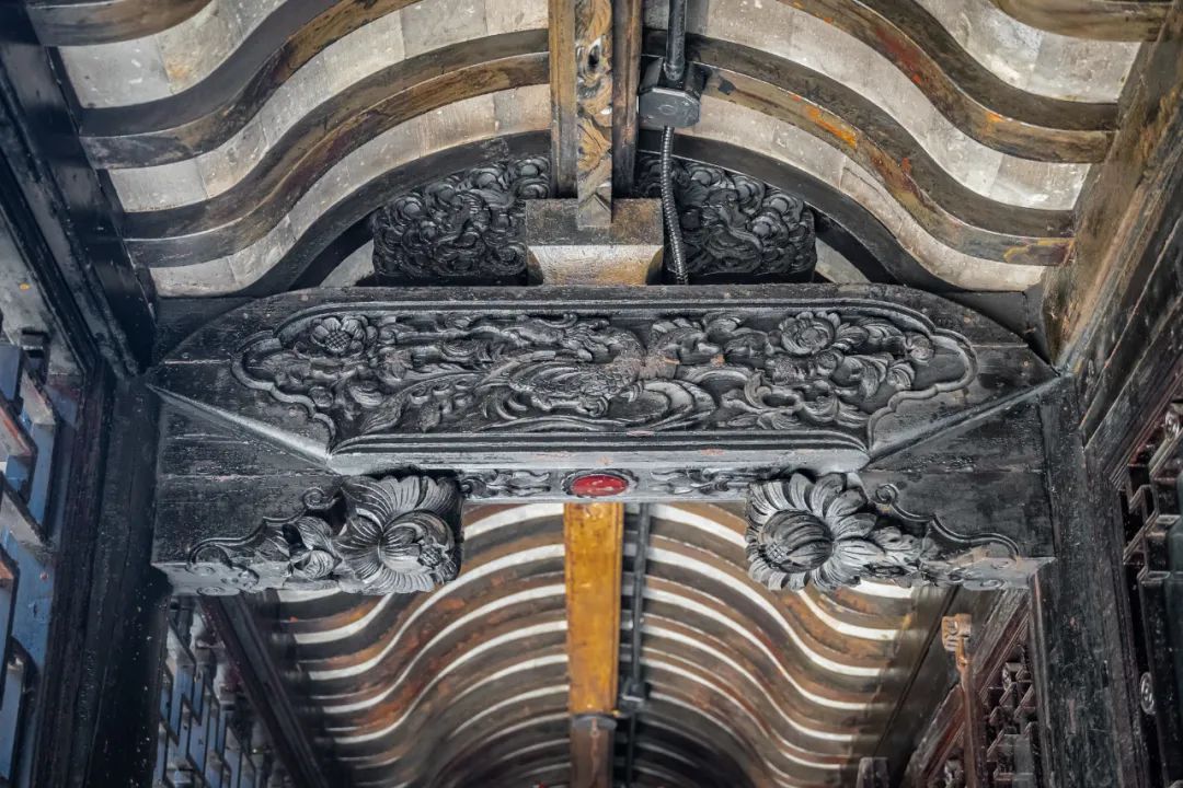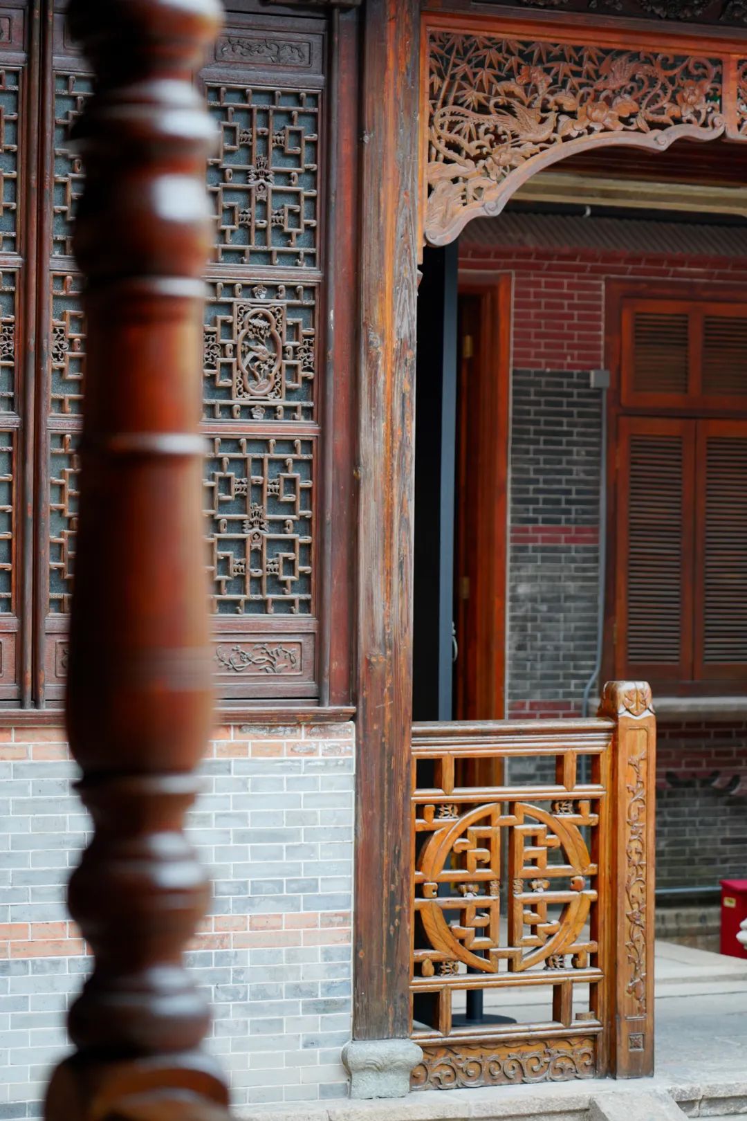 腰檐枋木上雕有穿枝二龙戏珠图案,门窗隔扇、楼梯扶手上也都是细节满满的中西式雕花,就连栏杆、挂落、雀替、斗拱等装饰小构件上也有精美的云纹、鸟兽浮雕,是上海非常少见的古代精品雕刻建筑。