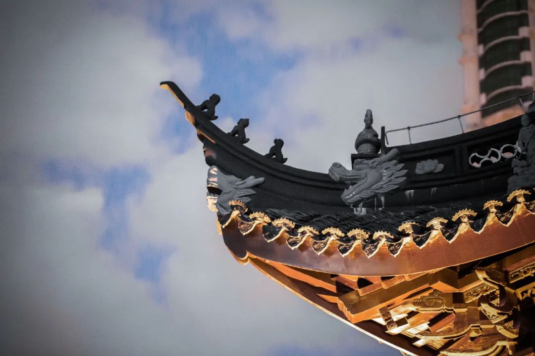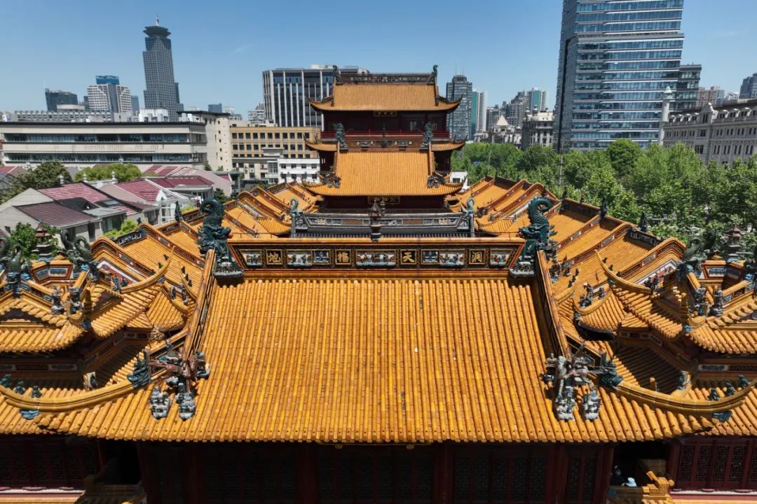 大殿中央宏丽的神龛、门口那块一米见方的鎏金双龙戏珠浮雕、屋顶处绘制着几条龙纹的“抱龙柱”,还有原汁原味的瓦片、地砖、彩绘、雕花......这一切仿佛向我们无声讲述着魔都那个年代的繁华。