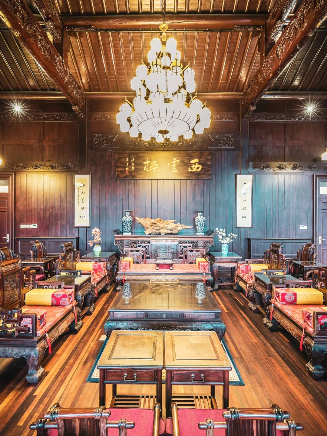 砖墙立柱、穿斗式木构架,榫卯组合、圆木柱承重墙,雪白的墙壁、黛青的小瓦片、翘檐马头墙......整栋楼朴素淡然却不失大气尊贵。