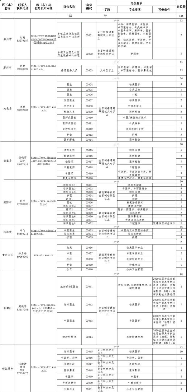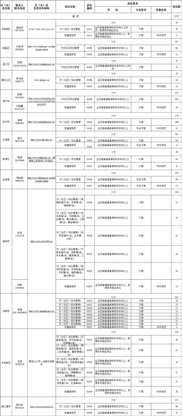 人民网成都7月8日电 据成都人社局官微消息,根据国家和省市关于进一步引导和鼓励高校毕业生到基层工作有关政策,为贯彻落实《成都市促进2020年高校毕业生就业创业十条措施》,2020年成都市高校毕业生服务基层项目拟公开招募“一村(社区)一名大学生计划(含党建指导员)”(以下简称“一村一大”(含党建指导员))“农村特设教师岗位计划”(以下简称“特岗教师”) “基层卫生机构大学生支医计划”(以下简称“支医”)人员共1699名。