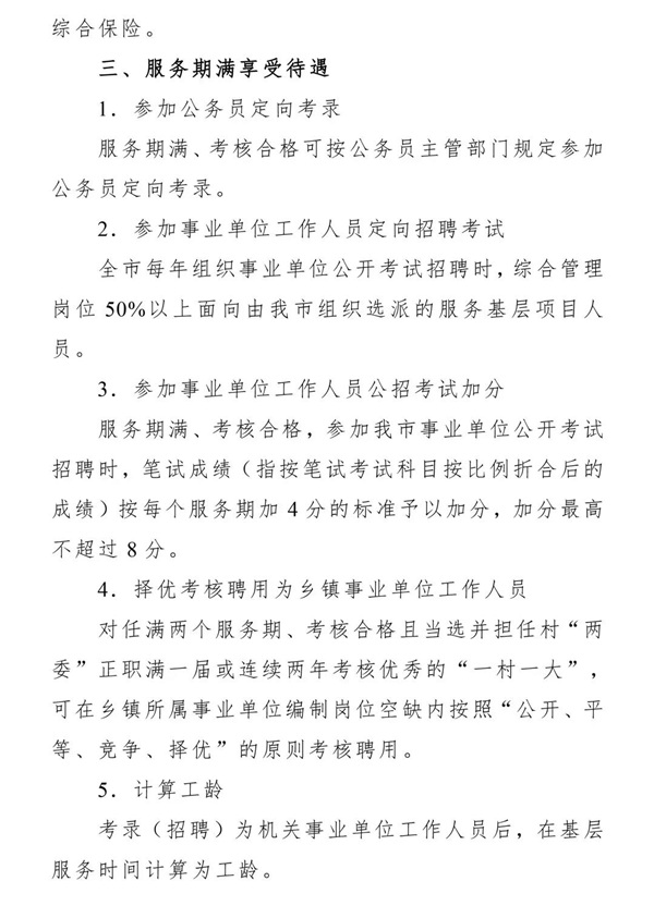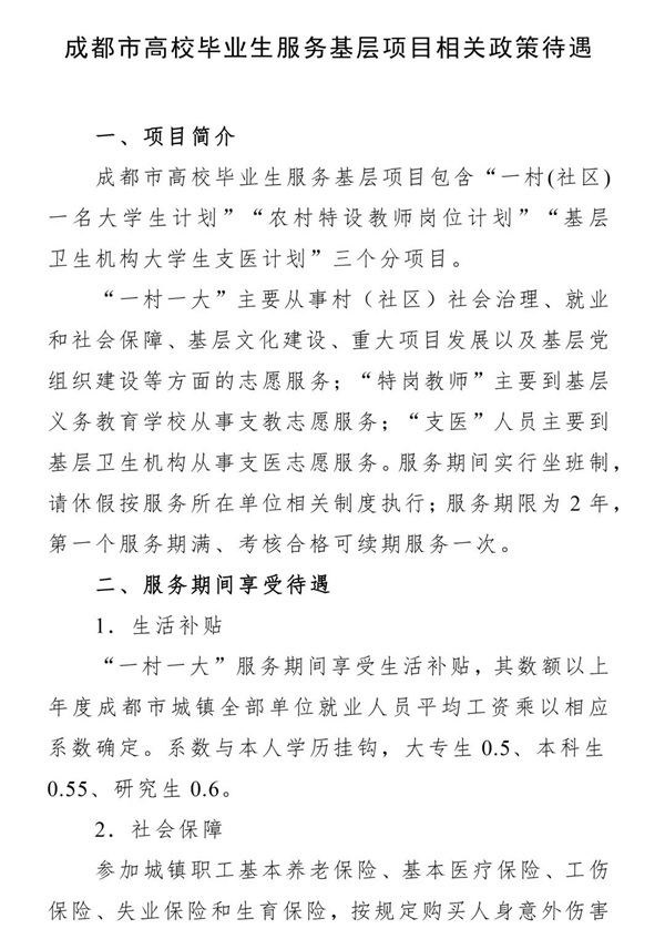 成都市高校毕业生服务基层项目相关政策待遇详见附件4。
