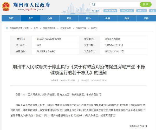 据荆州市政府官网消息,4月22日荆州市政府发布通知称,因与《省人民政府办公厅关于印发促进建筑业和房地产市场平稳健康发展措施的通知》部分条款内容不符,经市政府研究,决定停止执行4月20日发布的楼市政策。