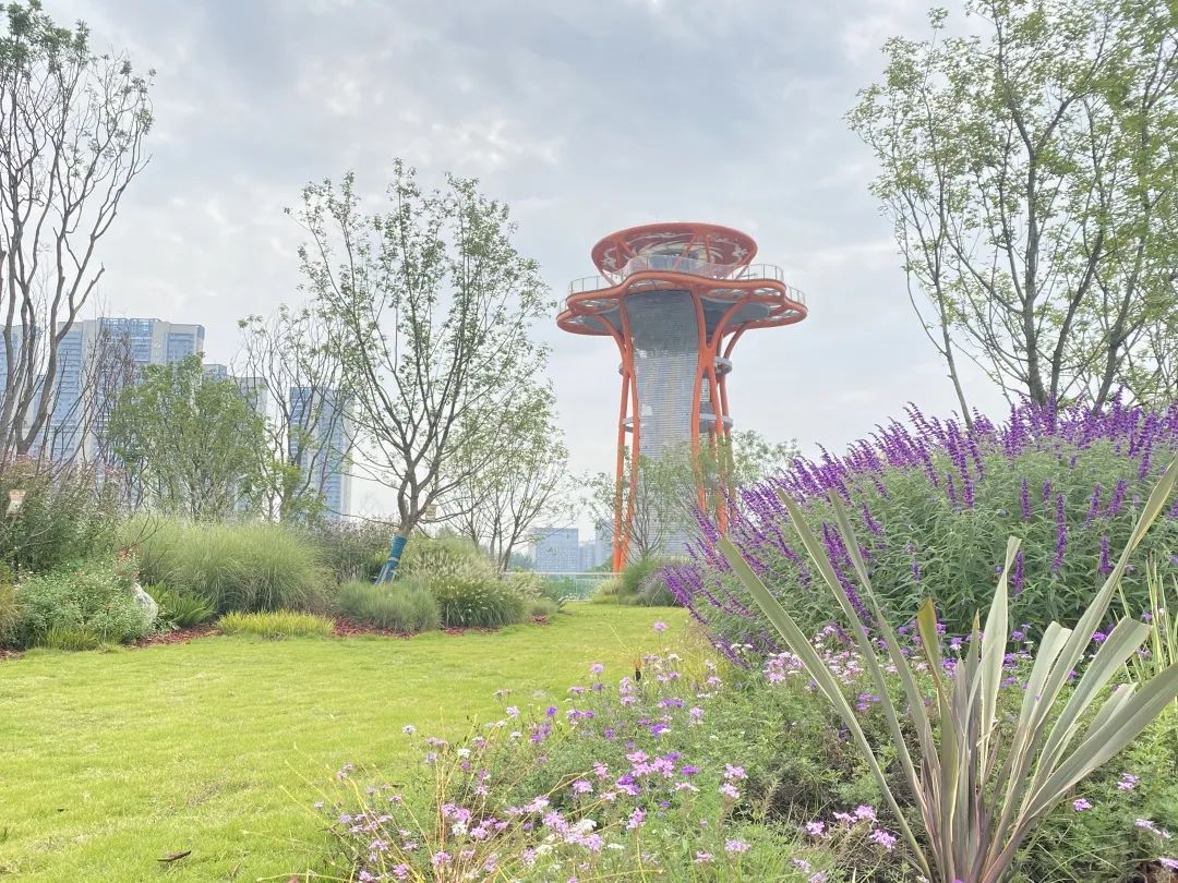 最吸引人眼球的,当属镶嵌在公园里的“芙蓉花”——锦江塔。塔高39米,设计灵感来源于芙蓉花与太阳神鸟。市民游客可乘坐观光电梯,来到塔顶的观景平台,公园全景一览无余,举目皆是绿色,放眼景色大好。