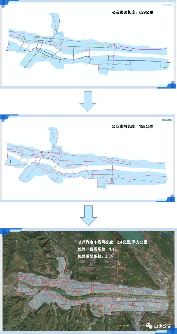 宝鸡市公交线网密度=2.4公里/平方公里,线路非直线系数=1.45,线路重复系数=3.34