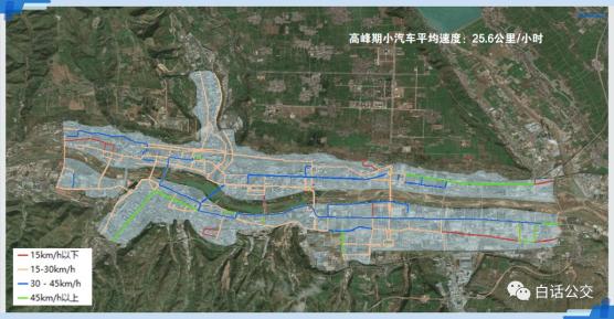 高峰期公交平均运营速度=15.9公里/小时,高峰期小汽车平均速度=25.6公里/小时,公交运营时速与小汽车时速比=0.6(1:1.6)