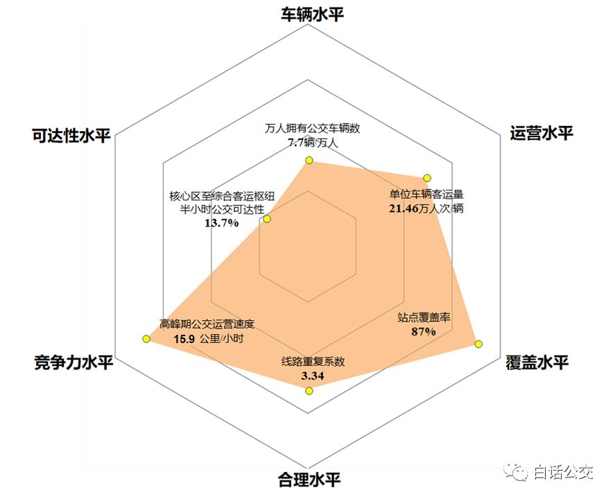 从12项指标中选取反应覆盖水平、合理水平、竞争力水平、可达性水平、车辆水平、运营水平共6个方面指标,生成城市公交发展基本情况雷达图。