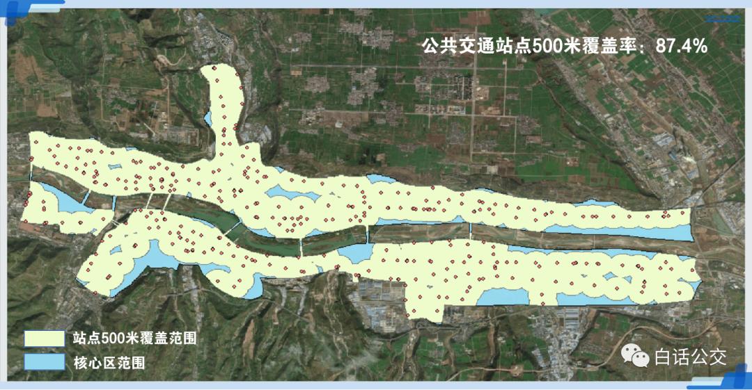 (1)公交站点覆盖率:核心区范围内公共交通站点500米半径覆盖面积与核心区面积之比。单位:%