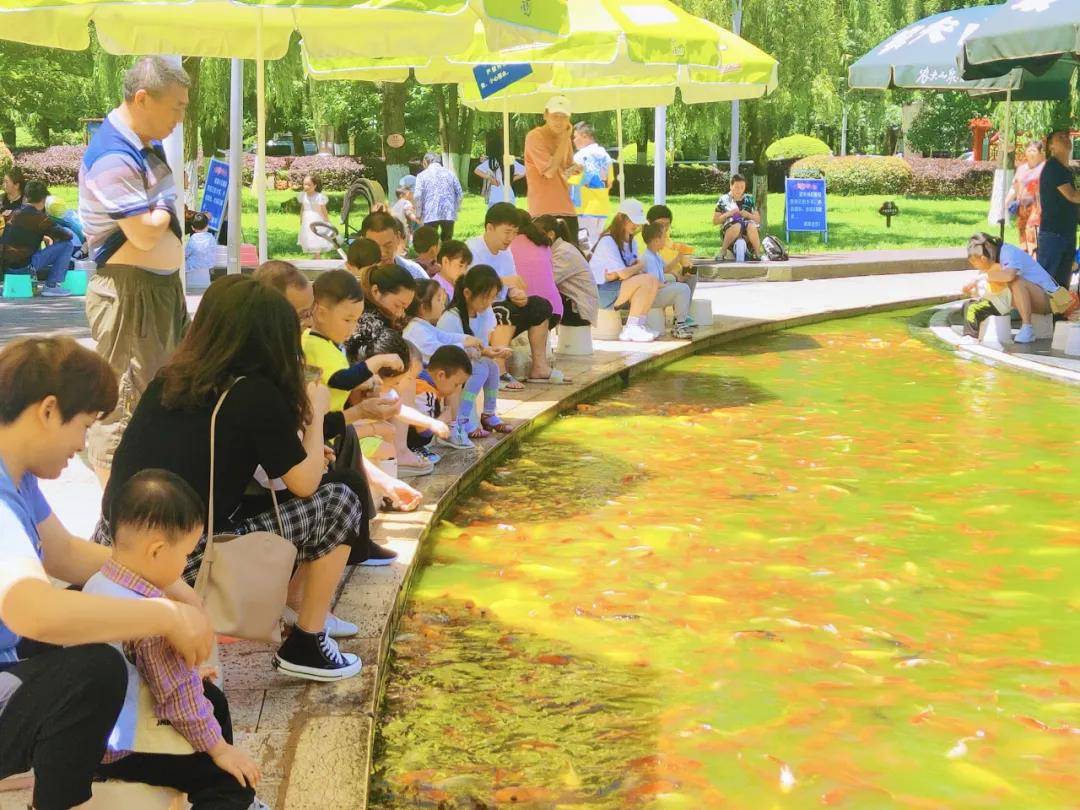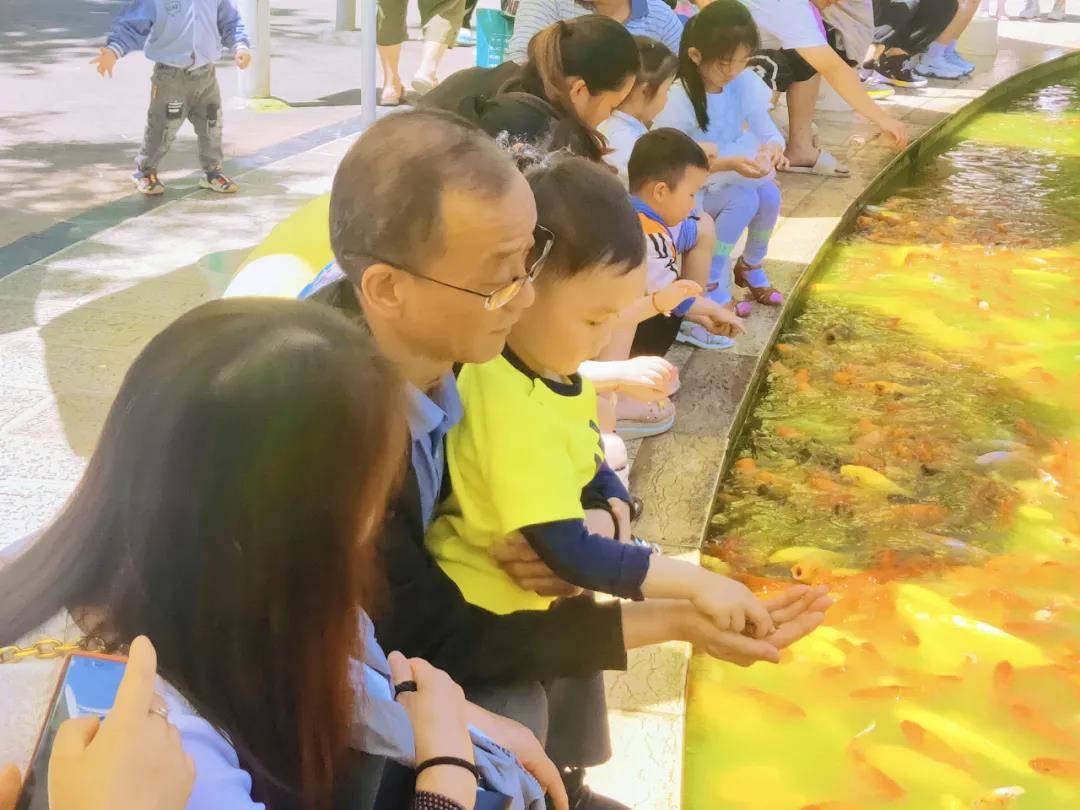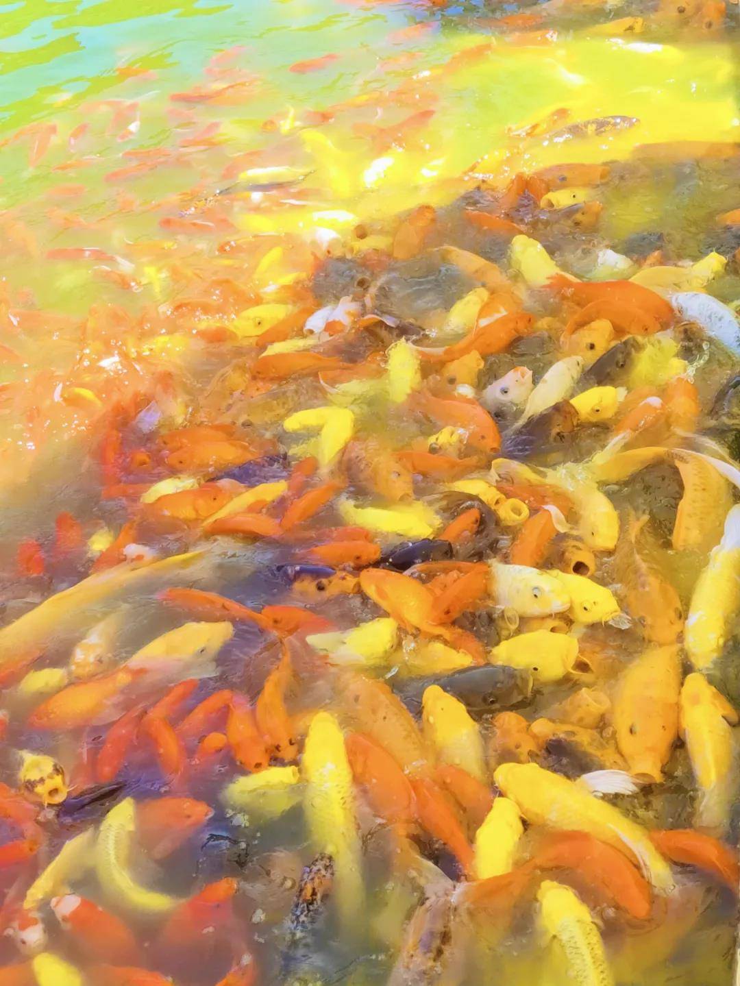 红橙黄白的小鲤鱼欢快地在水中嬉戏,你只要往水里撒上一些鱼食,就能看见它们蜂拥而上的壮观场面。