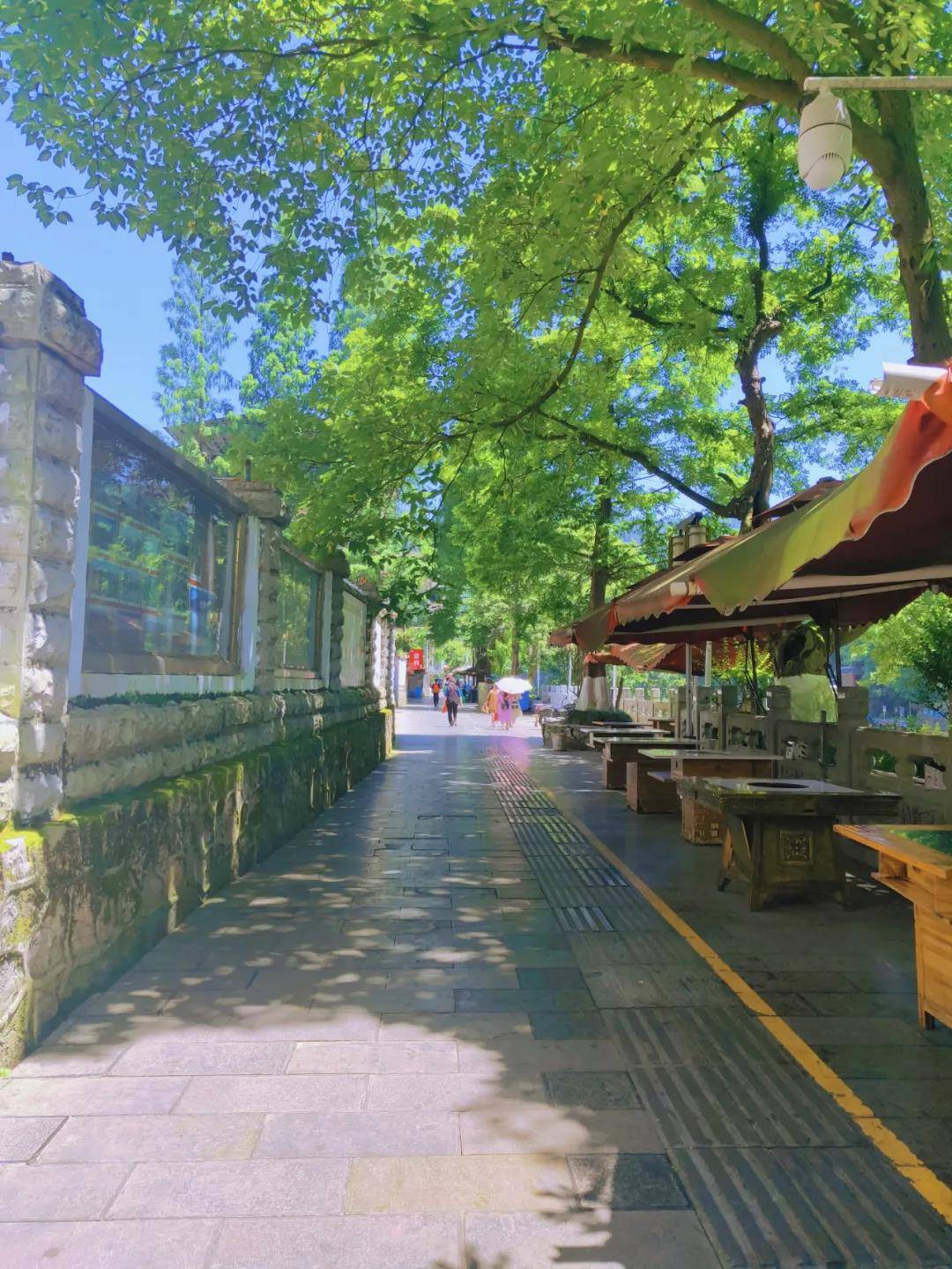 绿树蔽日、光影斑驳,风吹得树叶沙沙作响,偶有几只小鸟停留在青石板路上。