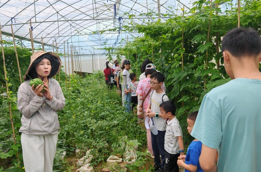 今年4月,大棚凉瓜“鲜行”上市,不但受到了市民热捧,还吸引了一批又一批亲子家庭、学校师生前来研学。为此,上巷村党支部结合村里特色凉瓜产业,“串点成线”设计出一条乡村研学路线,推出“杜阮凉瓜研学之旅”活动,研学点主要包括凉瓜种植大棚、上巷生态农场、凤眼果主题公园、进村彩虹道、凉瓜小馆、村党群服务中心等,让孩子们走进自然、体验农耕、学习知识,品尝劳动的乐趣。至今,已吸引近3000人次参与。