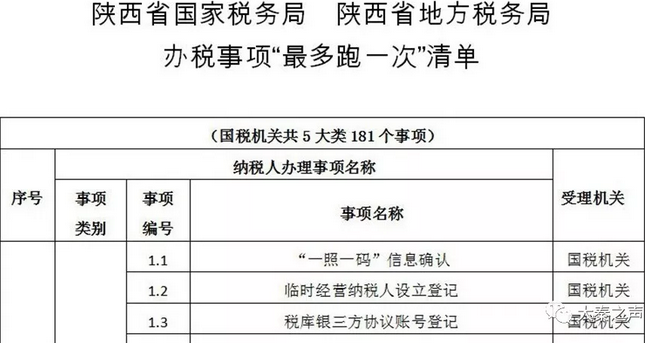 2018年3月30日,陕西省发布了《办税事项“最多跑一次”清单》。清单涉及315个的办税事项,其中国税业务181个事项,地税业务134个事项,发票申领、文书受理、纳税申报、简易注销等,纳税人只要资料完整且符合法定受理条件,只需要到税务机关跑一次就能把所有事项一次办结。这是陕西省2018年“营商环境提升年”的精彩之处、得意之笔。