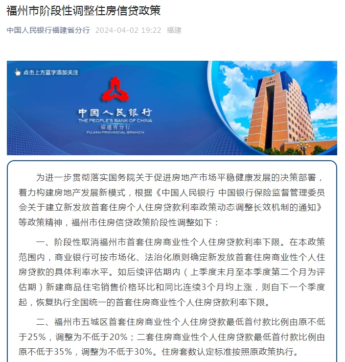 刚刚,中国人民银行福建省分行发布房贷新政,自2024年04月03日起施行。