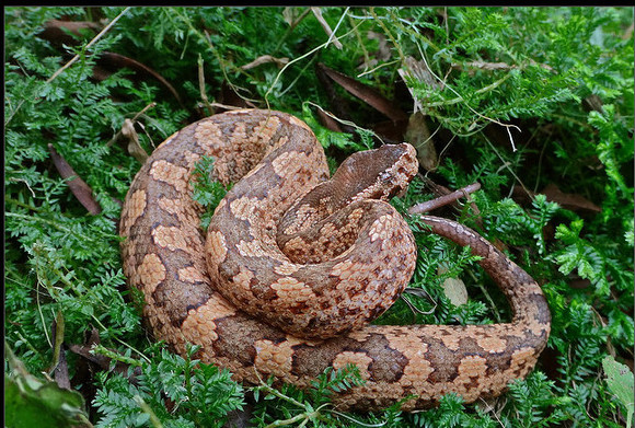 5,山烙铁头。为蝰科烙铁头属的爬行动物。山烙铁头蛇全长50~70cm,头三角形,有长管牙,吻端较钝,吻鳞宽远超过高,鼻间鳞大,互相接触,头顶具有细鳞。常栖于灌木林、草丛、茶山或耕地以及有时也见于路边及住宅周围。