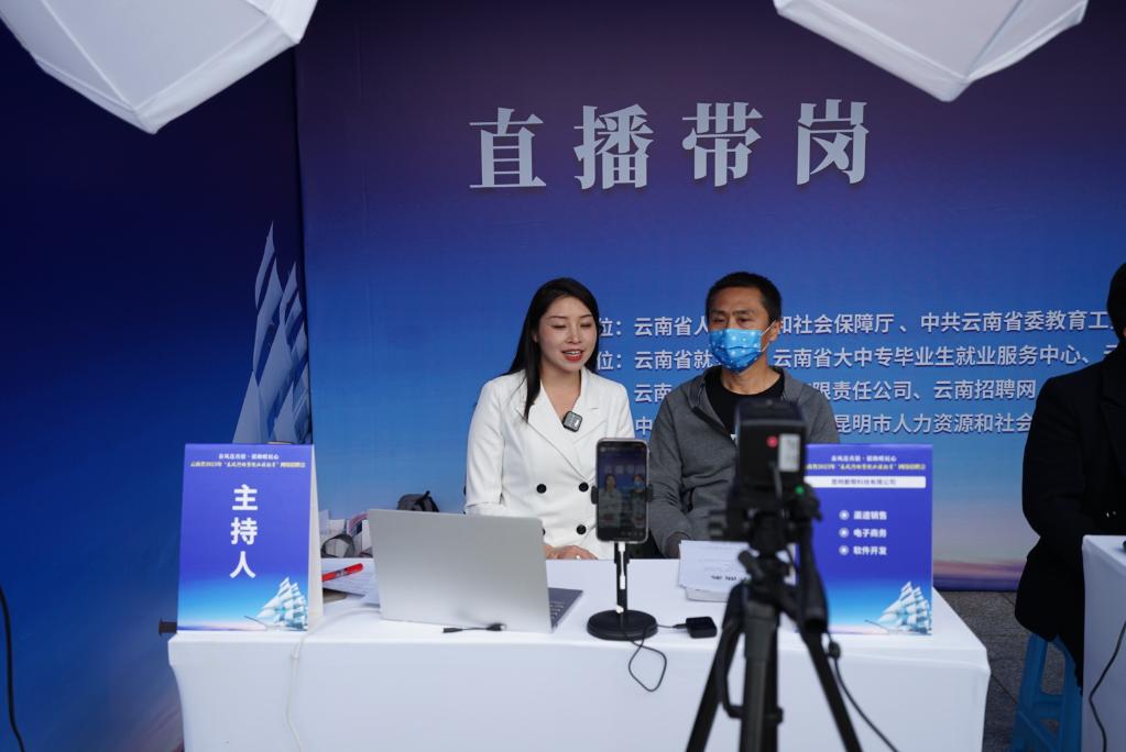 2023年3月3日,在云南省2023年春风行动暨就业援助月专场招聘活动现场,工作人员“直播带岗”。新华社记者 佟璐 摄