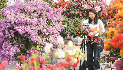 江苏省宿迁市沭阳县被称为“花木之乡”。近年来,当地通过电商直播等方式促进花木产业转型。图为村民在沭阳县颜集镇堰下村幸福花海电商直播基地进行网络直播。