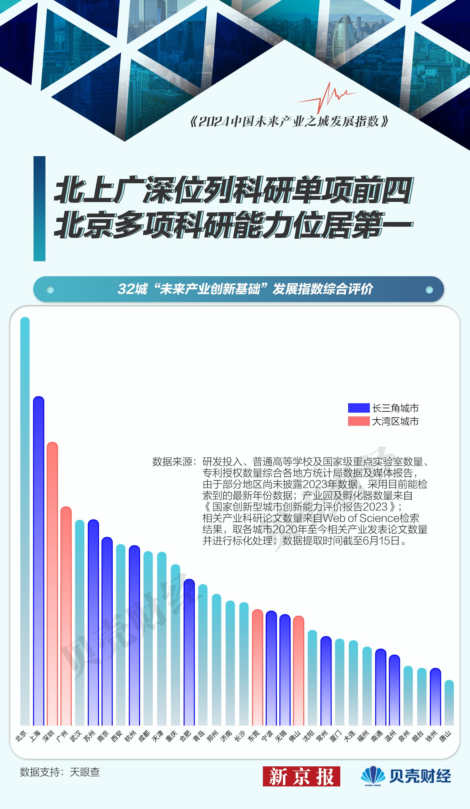 7月9日,在“中国经济向新而行”夏季峰会深圳分论坛“新质生产力下的中国智造”中,新京报贝壳财经首次发布《2024中国未来产业之城发展指数》(以下简称《报告》)。在清华大学二十国集团(G20)创业研究中心的指导下,推出“2024中国未来产业之城发展指数”,通过梳理六大未来产业方向中初具规模的21个产业共710万余条企业数据,对32个万亿GDP城市及准万亿GDP城市的未来产业发展程度进行评价,综合城市政策、科研基础等,挖掘城市未来产业发展潜力。