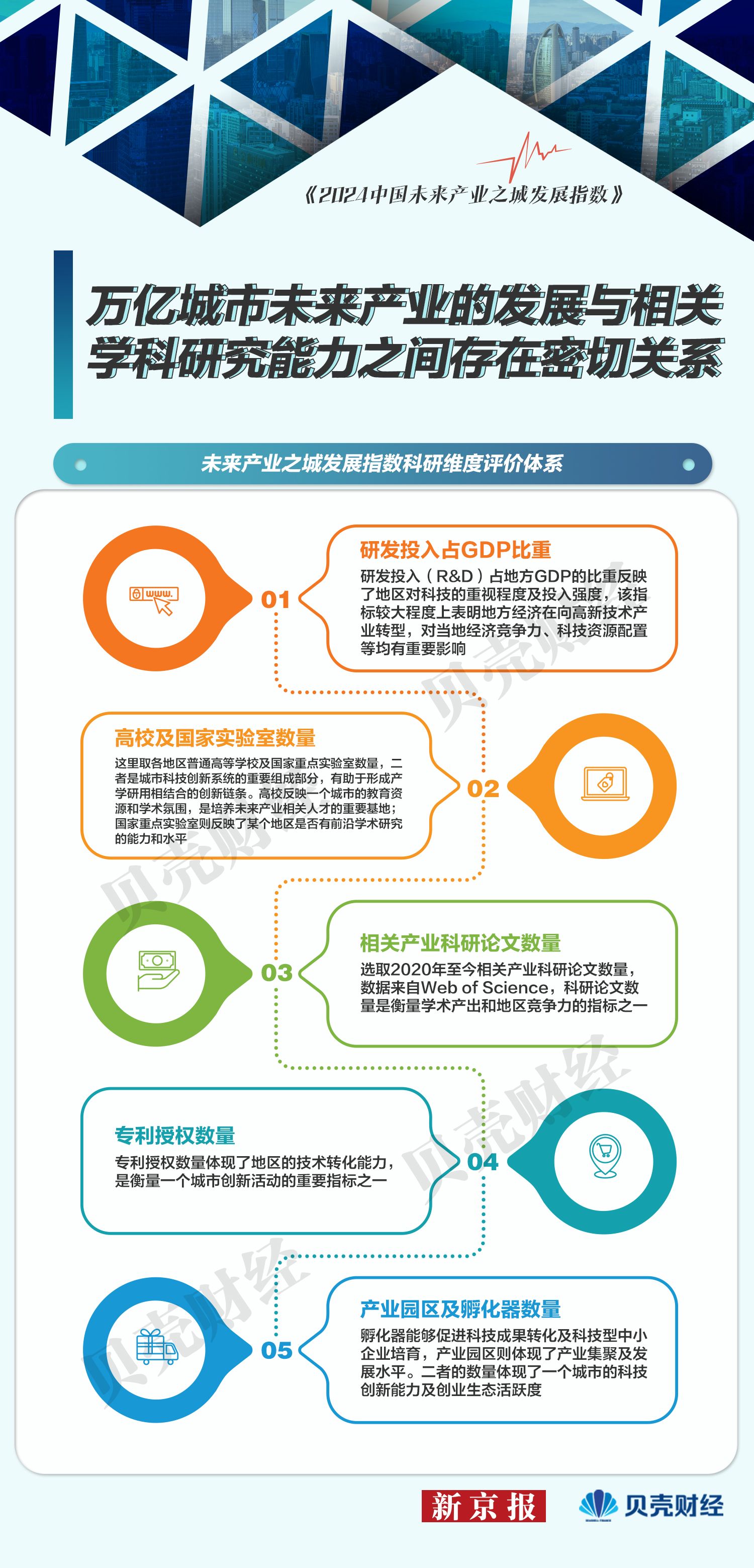 在针对各城市未来产业的科研评价上,新京报贝壳财经主要选取以下五个指标:各城市研发投入占地方GDP比重、普通高校国家重点实验室数量、相关产业科研论文数量、专利授权数量、产业园及孵化器数量,权重占比各3%。根据每个城市对应的数据情况,将各数据维度进行标准化处理,再加总形成对该城市的整体科研评价分数,结果满分为15分。