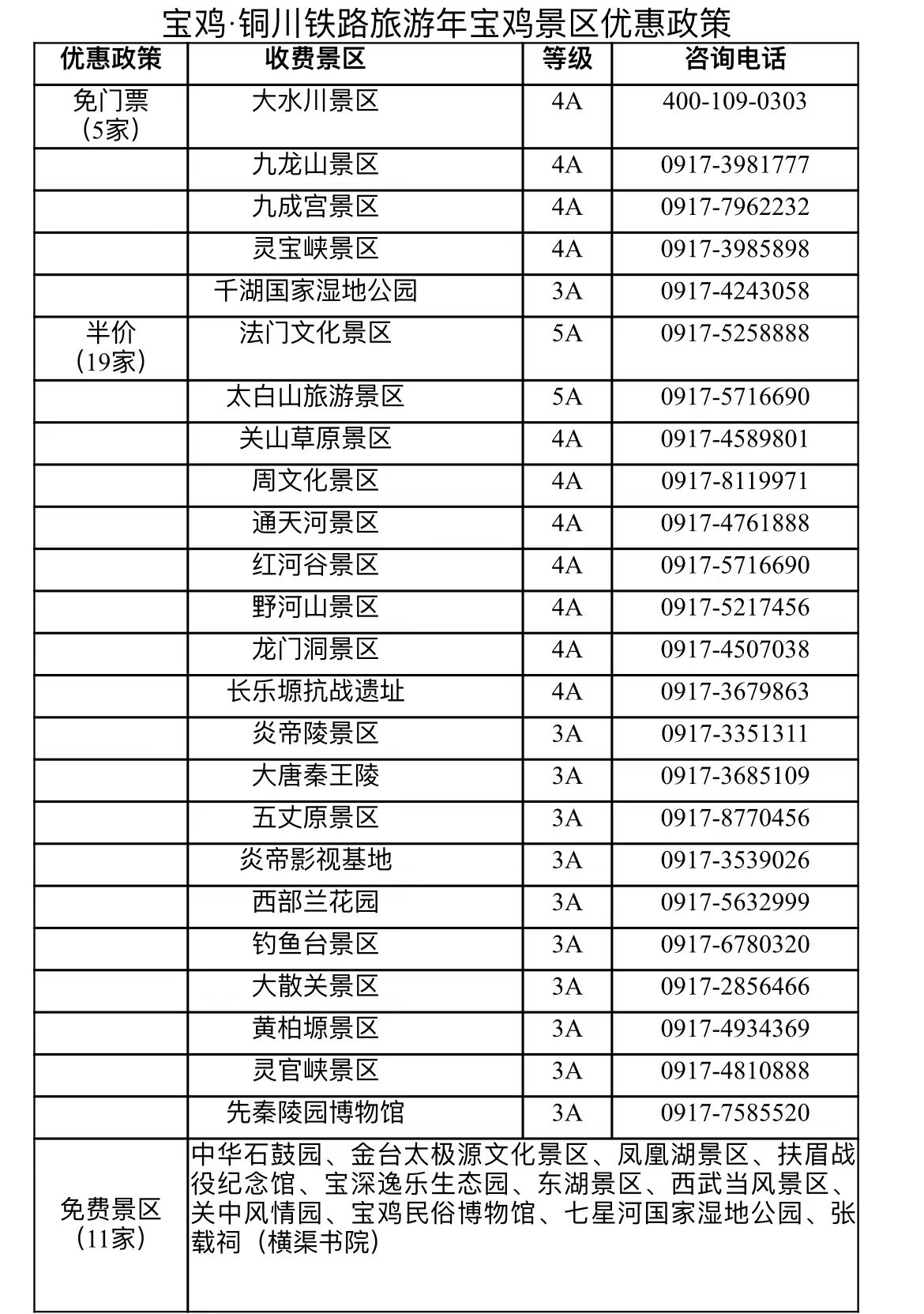 凡持本人铜川至宝鸡火车票(宝鸡境内站下车)及身份证,在宝鸡10日内可享受景区免门票或者半价优惠政策(时间为:8月20日至12月31日)。