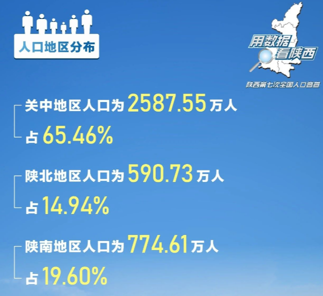 分区域看,关中地区人口为2587.55万人,占65.46%;陕北地区人口为590.73万人,占14.94%;陕南地区人口为774.61万人,占19.6%。