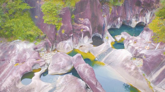 来到九龙洞景区,犹如进入一座现代雕塑的艺术大观园,在长达10多公里的溪段间,放眼望去,满溪皆臼:爱心石臼、阴阳石臼、蝌蚪石臼、漏斗石臼、连环石臼、天眼石臼……自然造物的鬼斧神工挥洒淋漓,令人目不暇接。