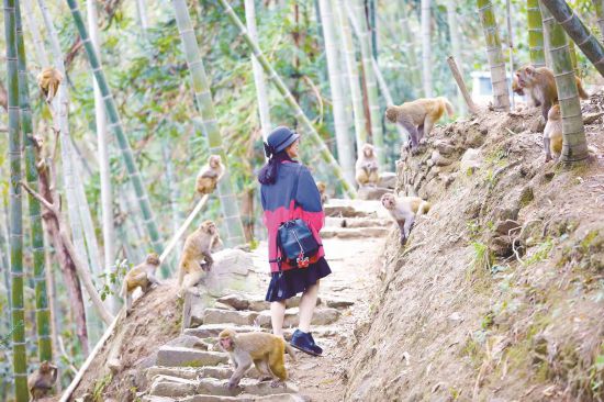 游客穿行在白云山野生猕猴谷。