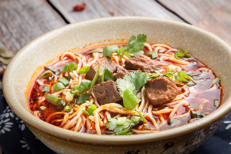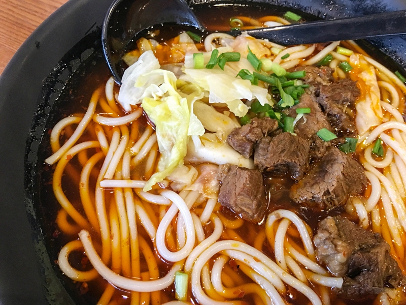 重碱细面,红油宽汤,牛肉臊子入口即化,用上经文火细熬猪骨而成的汤汁做底,再配上一点细碎香菜,一点韭黄提味,独特的内江牛肉面便可出锅。