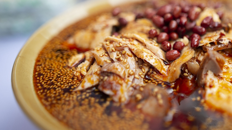 荥经棒棒鸡已有二百多年的历史,菜品包括红油鸡、椒麻鸡、家常鸡等。棒棒鸡制作工艺之精湛、刀法之考究,风味之独特堪称一绝。全鸡肉片或叠成梳面拱型,或复原“金凤卧巢”,配上独特的调料(一般选用朝天辣椒,本土上等菜油炼成熟油;花椒选用汉源娃娃椒为主打调料),或盛于盘角,或淋洒鸡面,白里透红,红里飘香,诱人食欲。