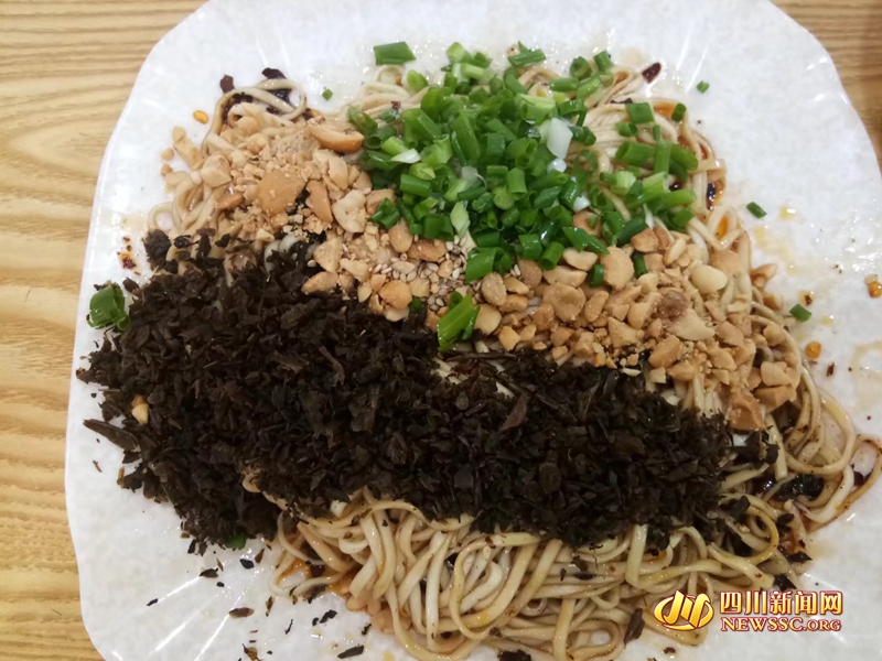 燃面,因其油重无水,点火即燃,故名“燃面”。燃面原料选自宜宾当地优质水面条,以宜宾碎米芽菜、小磨麻油、鲜板化油、八角、山奈、芝麻、花生、核桃、金条辣椒、花椒、味精以及香葱、豌豆尖或菠菜叶等辅料,将面煮熟,捞起甩干,去除碱味,再按传统工艺加油佐料即成。