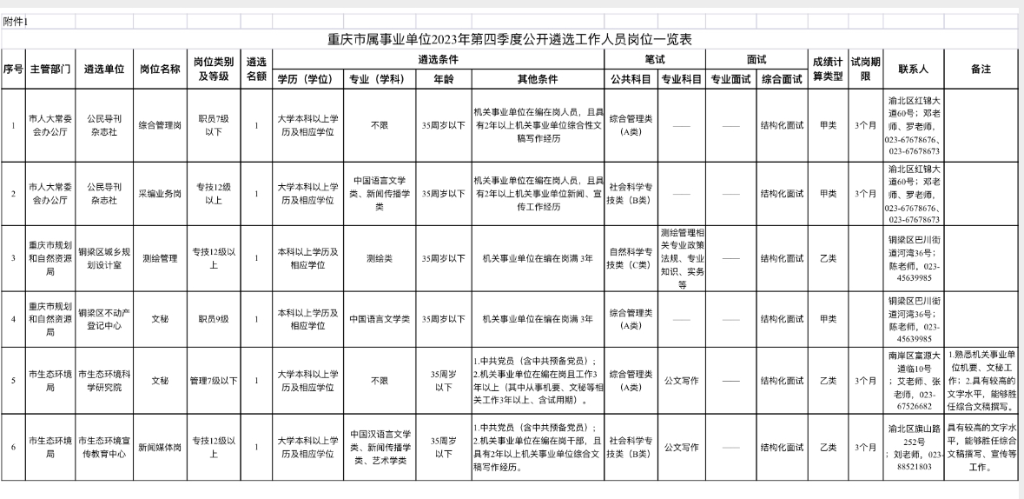 11月29日,重庆市人力社保局发布了《重庆市部分市属事业单位2023年第四季度公开遴选工作人员公告》。本次公民导刊杂志、铜梁区城乡规划设计室、市生态环境科学研究院等5个市属事业单位公开遴选工作人员6名。