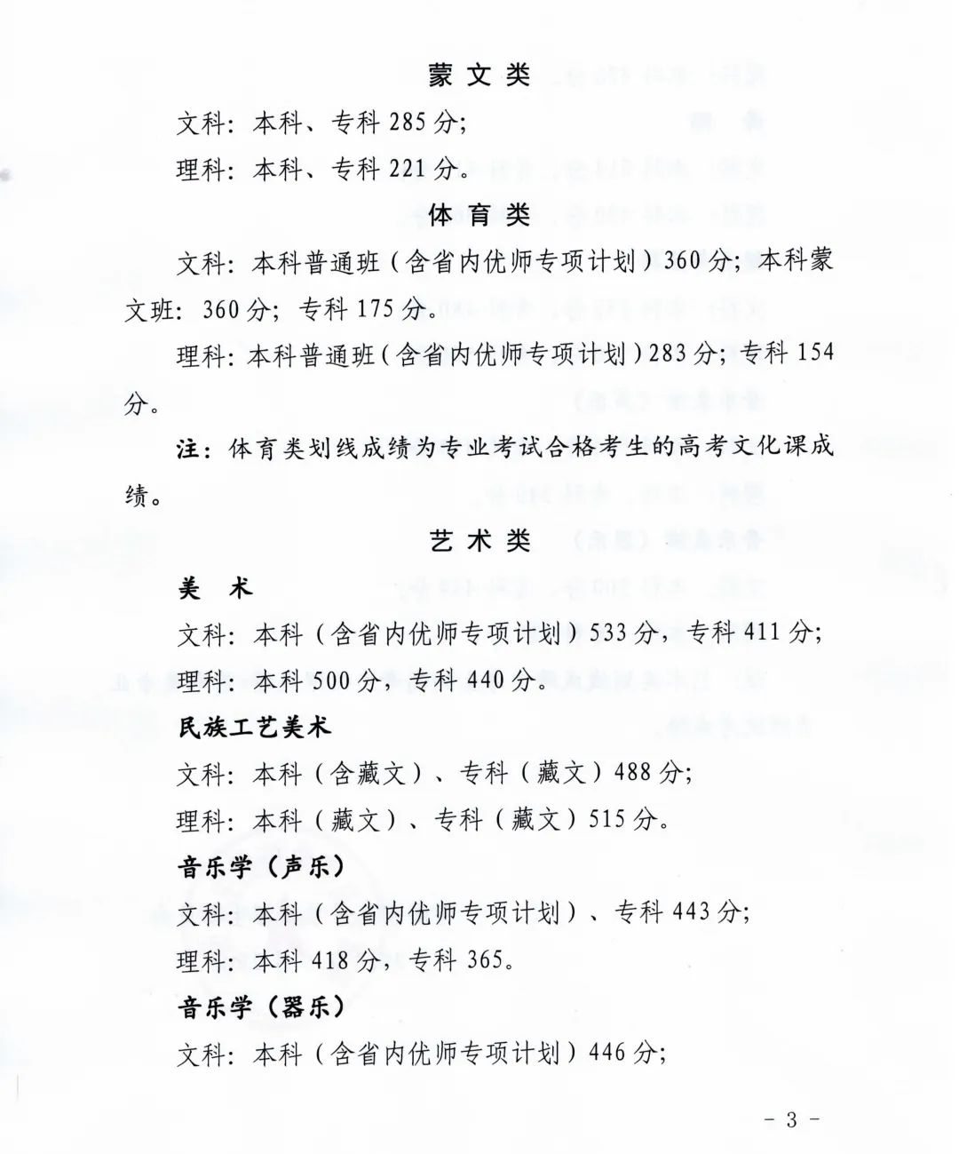 3.艺术类(艺术文、艺术理)专科录取最低控制分数线为105分。