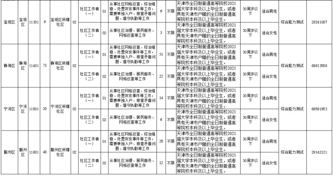 为加强党对城市基层工作的领导,扎实推进党建引领基层治理,建强基层治理骨干力量,根据《天津市社区工作者管理办法》(津党厅〔2017〕104号)等有关规定,2021年,天津市计划招录社区工作者1437名,其中滨海新区160名、和平区23名、河东区209名、河西区80名、河北区100名、南开区138名、红桥区16名、东丽区80名、西青区166名、津南区100名、北辰区173名、武清区50名、宝坻区9名、静海区73名、宁河区20名、蓟州区40名,统筹安排到所辖社区工作。现就组织招录有关事项公告如下: