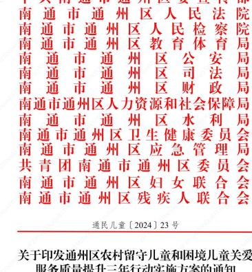 注重顶层设计,联合15部门出台《南通市通州区农村留守儿童和困境儿童关爱服务质量提升三年行动实施方案》,围绕农村留守儿童和困境儿童保护、成长、发展三大需求,实施精准帮扶、监护提质、安全防护、心力滋养、固本强基“五大工程”,使对象儿童的生存权、发展权、受保护权、参与权等权利得到更加充分、更加有效的保障。