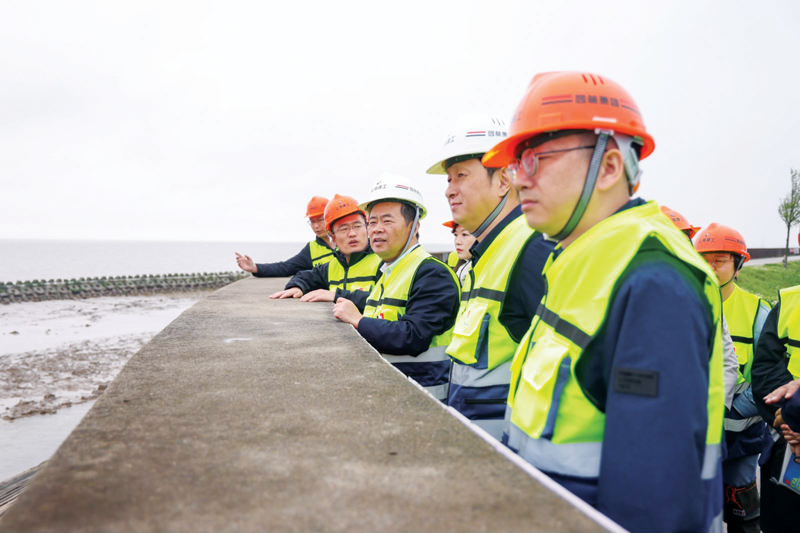 张勇伟(左三)调研上海奉贤滨海海洋生态保护修复项目。