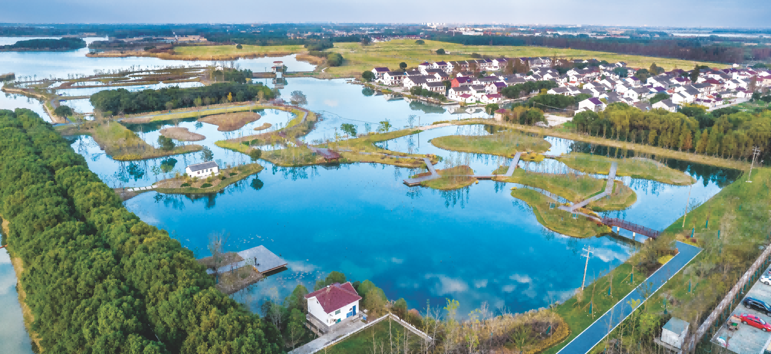 项目位于上海市青浦区金泽镇新池村,为长三角生态绿色一体化发展示范区原点“水乡客厅”先行启动区重点项目之一,通过水系梳理、林业梳理、圩田整治、智慧加持,形成以生物多样性为基底、体现江南水乡基因的样板工程。基于“生态-生产-生活”三生融合的整体人文与自然生态系统,通过对“水-绿-人”三者关系的研究,引导场地动植物群落的自发性演替,为长三角地区的鱼塘养殖与湿地净化、动物栖息地恢复相结合提供了研究的新范本。