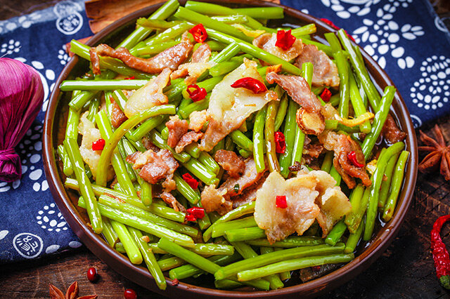 藜蒿炒腊肉是江西一道特色名菜,属于赣菜,其主料藜蒿主产自鄱阳湖沿岸一带。其做法是先将藜蒿去根后的嫩茎切成段,腊肉切成丝;先炒腊肉,后加入藜蒿和葱段煸炒,加入汤料,片刻起锅即成,成菜后,腊肉金黄,藜蒿青绿,脆嫩爽口,且有一股特别的清香味道。这道菜最早是生活在鄱阳湖边的渔民发明的,因其烹饪后具有一股特殊的水草清香,慢慢传入南昌百姓的餐桌,成为南昌的一道名菜。藜蒿炒腊肉被江西省旅游局评为“游客最喜爱的十大赣菜”,更是被中国烹饪协会评为“中国菜之江西十大经典名菜”。 【 详细>>】
