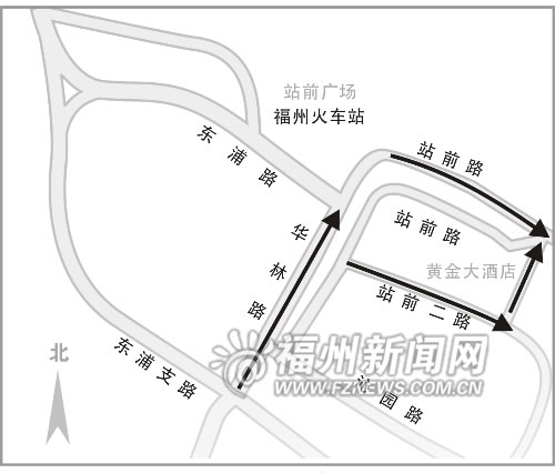 为了加强福州火车站周边地区的交通管理,警方实行华林路(东浦路口至站前广场)由南向北单向通行。站前路(东起站前路铁三小区门口,西至站前路站东路口)实行机动车由西向东单向通行。