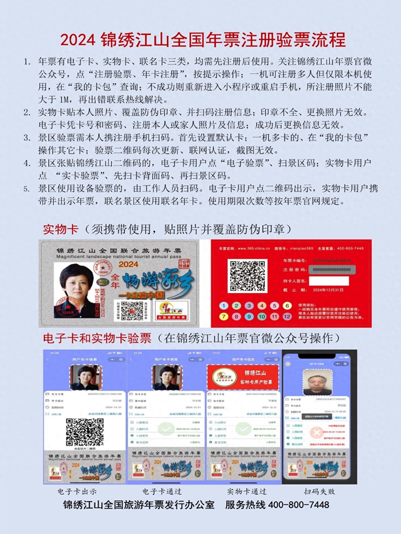 年票实行一人一票制,办理手续简单,各地户外店、旅行社,微店、抖音店、淘宝店、票务网等渠道均可代理。凭年票在景区扫码游览,电子卡需配合手机使用,注册本人照片和信息后有效;实物卡需携带使用,配自动盖印章的防伪膜,自行贴照片并注册后有效。具体名录和游览指南在年票官网、官微nianpiao365发布并实时更新,任何问题请拨打客服热线400-800-7448解决。