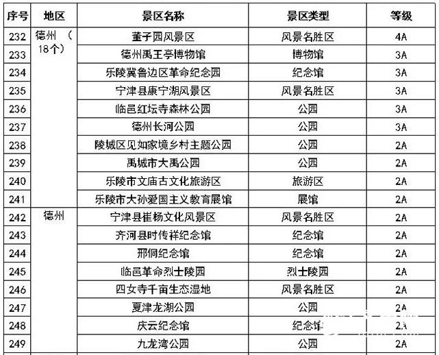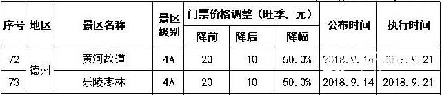 其中,德州夏津黄河故道、乐陵枣林景区门票价格均从20元降至10元,降幅50%;董子园风景区、德州禹王亭博物馆、乐陵冀鲁边区革命纪念园、宁津县康宁湖风景区、临邑红坛寺森林公园、徳州长河公园、陵城区见如家境乡村主题公园、禹城市大禹公园、乐陵市文庙古文化旅游区、乐陵市大孙爱国主义教育展馆、宁津县崔杨文化风景区、齐河县时传祥纪念馆、邢個纪念馆、临邑革命烈士陵园、四女寺千亩生态湿地、夏津龙湖公园、庆云纪念馆、九龙湾公园等18个景区免费。