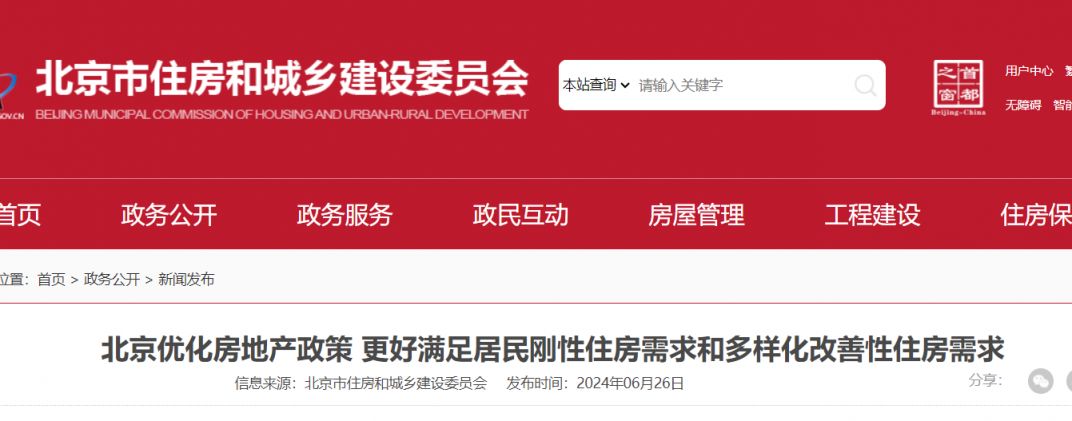 为贯彻落实党中央、国务院决策部署,本市坚持房子是用来住的、不是用来炒的定位,适应本市房地产市场供求关系的新变化,顺应人民群众对优质住房的新期待,更好满足居民刚性住房需求和多样化改善性住房需求,促进房地产市场平稳健康发展,6月26日,北京市住房和城乡建设委员会、中国人民银行北京市分行、国家金融监督管理总局北京监管局、北京住房公积金管理中心联合印发《关于优化本市房地产市场平稳健康发展政策措施的通知》(以下简称《通知》),明确实施调整商业性个人住房贷款最低首付款比例和利率下限,调整住房公积金个人住房贷款最低首付款比例,支持多子女家庭改善性住房需求,提高购买绿色建筑、装配式建筑或者超低能耗建筑的住房公积金贷款额度,组织开展住房“以旧换新”活动等政策措施。《通知》自2024年6月27日起施行。
