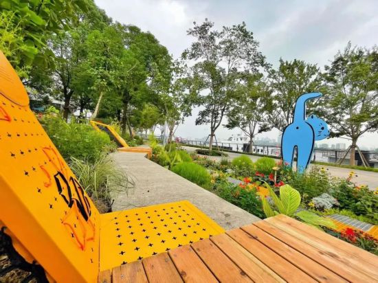 四川北路公园以中共四大纪念馆为核心,构建了包括国旗广场、中国共产党精神谱系连廊、“虹”色足迹年轮大道等在内的红色文化矩阵,并通过公园路径及树池花坛的空间布局,使游客在公园中获得纪念性体验。