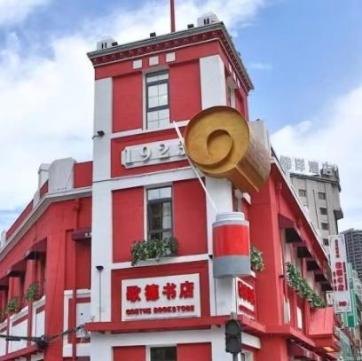 这个百岁建筑地处欧风街起点,结合书轴和酒桶元素设计的笔筒组成建筑外立面,书轴上写着歌德的诗歌“爱在身边”。新古典主义的装饰风格,复古的木质书架、红丝绒沙发、老式留声机……当中西文化碰撞交融,最是书香能致远。