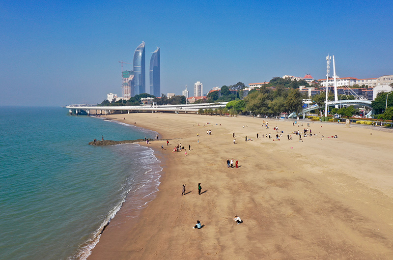 游客在厦门大学附近的白城沙滩游玩(12月12日摄,无人机照片)。