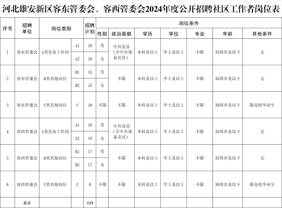容东管委会、容西管委会公开招聘专职社区工作者123名,详见《河北雄安新区容东管委会 容西管委会2024年度公开招聘专职社区工作者岗位表》。