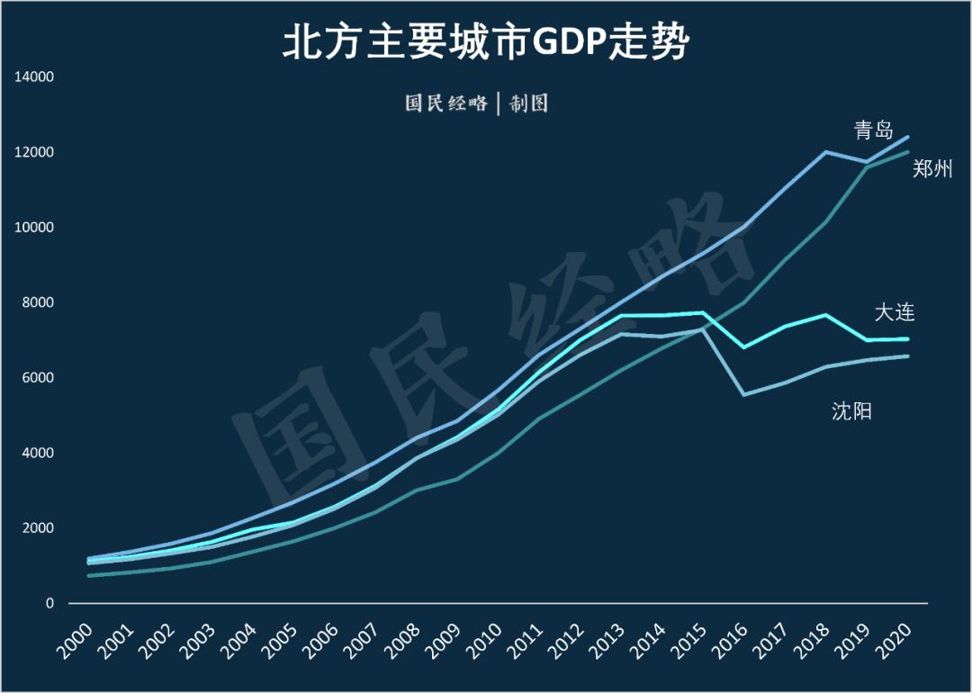 2020年,郑州GDP达到1.2万亿。过去十年,郑州先后赶超烟台、东莞、沈阳、大连、佛山,直追青岛,成为北方经济第三城的有力竞争者。