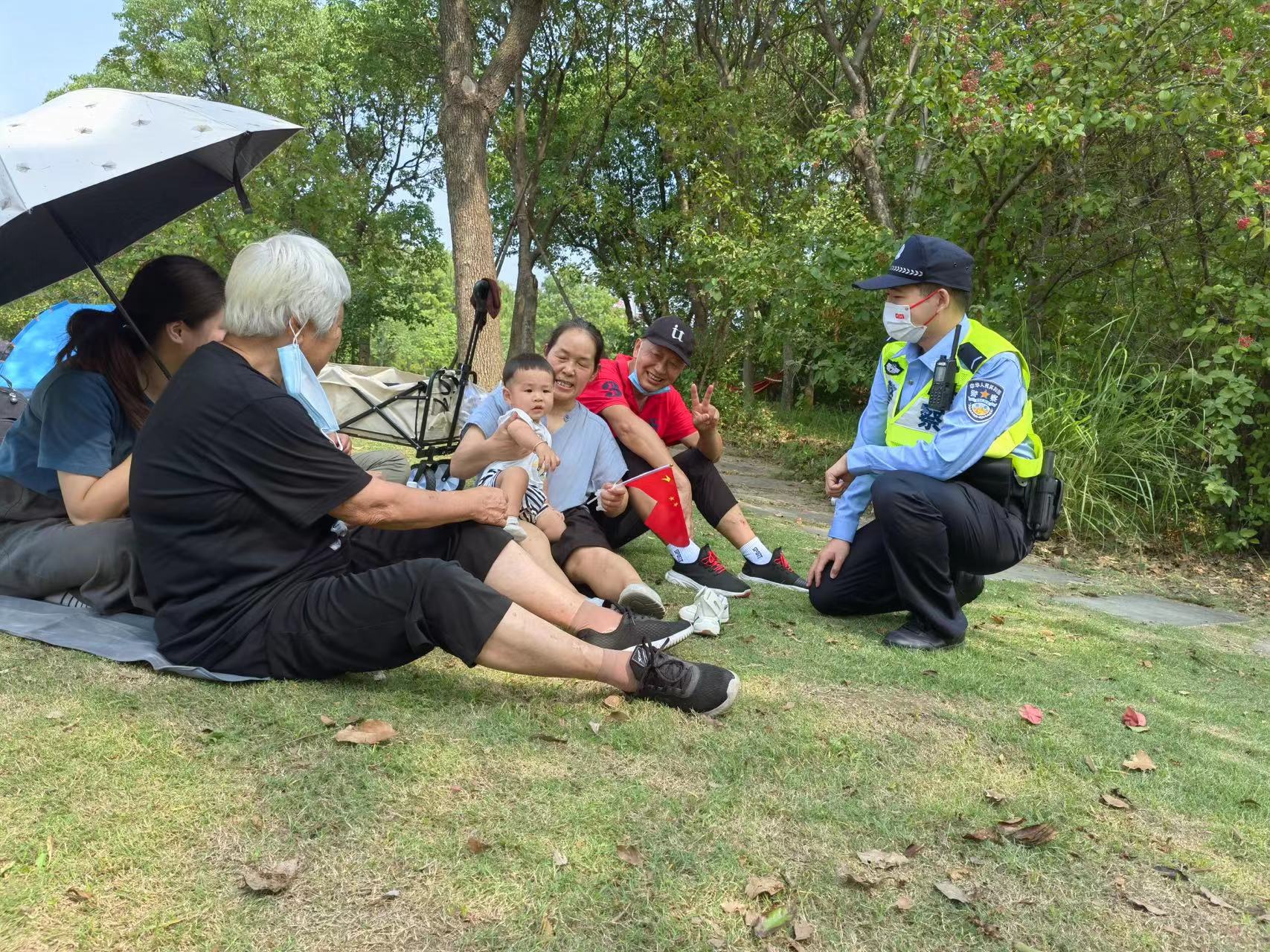 执勤民警除了在游乐区巡逻防范走失,在码头和小桥驻守提示防溺水外,在草坪区域的露营、野餐的游客也是民警关心的重要群体。“我们主要是从草坪禁火和露营防遗失两个方面进行宣传防范,既要维护景区的安全环境,也要避免游客的财产遭受损失。”民警徐佩玺如是说。在巡查中,民警还需要警察提醒游客合理保持天幕和帐篷间距,以防密集“扎营”和乱拉风绳造成的游客绊倒情况发生。(王文娟、马凯、崔顺成、陆泽昭)