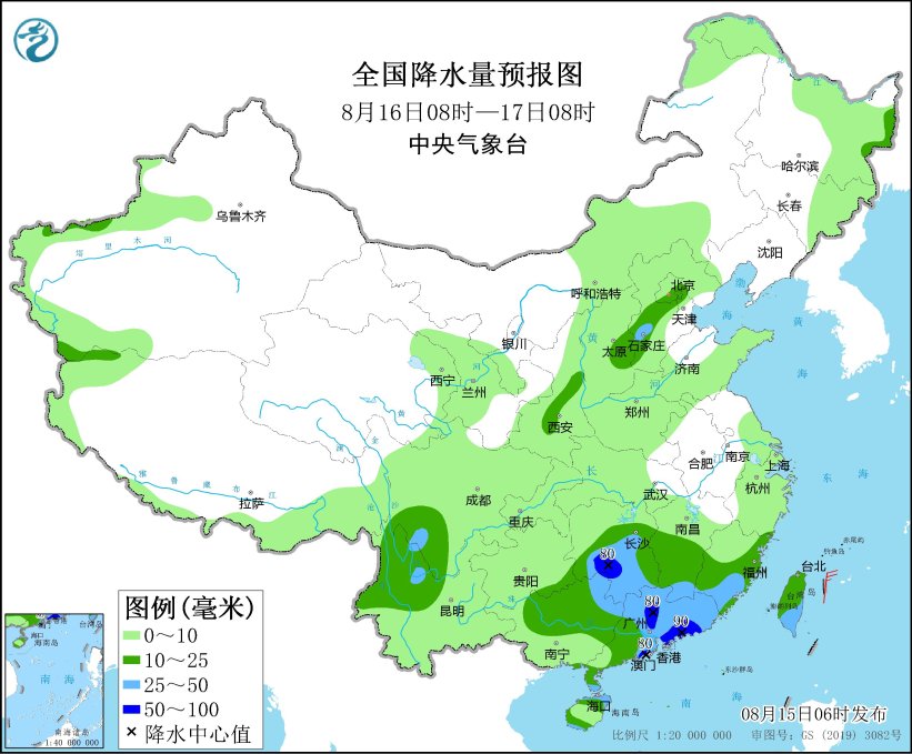 8月16日08时至17日08时,华北中部、陕西中部、江南中南部、华南大部、云南西北部、四川西南部、台湾岛等地部分地区有中到大雨,其中,湖南西南部、广东中部和南部沿海等地局地有暴雨(50~90毫米)(见图3)。